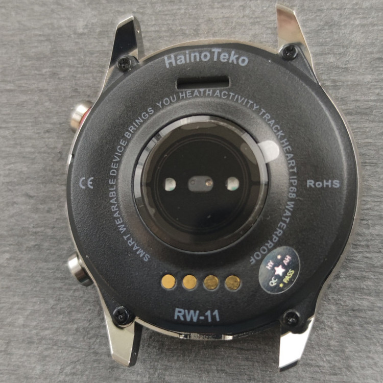 ساعت هوشمند RW-11 توسط شرکت هاینو تکو آلمان طراحی شده است. دو عدد بند سیلیکونی و طرح چرم به همراه ساعت قرار داده شده است که متناسب با سلیقه و موقعیت می توانید به راحتی بندها را تعویض نمایید. شارژر ساعت از نوع پین مگنت است. ظرافت بالا و زیبایی ظاهری کاملا در طراحی رعایت شده است. سنسور چرخش دست این ساعت دارای دقت بالایی است که برای چک کردن زمان دیگر نیازی به فشردن دکمه وجود نخواهد داشت. کیفیت سنسورهای سلامتی این ساعت هوشمند نسبت به تمام ساعت ها در این رنج قیمتی بالاتر است. این اسمارت واچ دارای منوی فارسی و فونت زیبای فارسی برای نمایش پیام ها است که نگرانی در خصوص نمایش شکسته حروف و عدم پشتیبانی از پیام های فارسی وجود نخواهد داشت. میکروفون و اسپیکر به کار گرفته شده در این ساعت دارای کیفیت بسیار بالایی هستند که پخش موزیک و مکالمه را با کیفیت بسیار بالا ممکن می سازد.