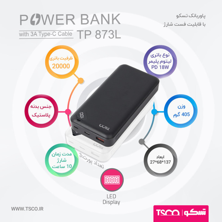 شرایطی را تصویر کنید که در حین سفر هستید و دسترسی به برق ندارید یا برق رفته و به گوشی هوشمندتان نیاز دارید. در این صورت به ضروری بودن این دستگاهها در کنار دستگاههای شارژی پی خواهید برد. پاور بانک تسکو از 3 درگاه خروجی USB بهره میبرد؛ از این رو میتوانید سه دستگاه مختلف را به طور همزمان شارژ کنید. این شارژر همراه 20000 میلی آمپرساعت ظرفیت دارد. استفاده از مواد اولیهی با کیفیت در کنار طراحی زیبا و شیک باعث شده استفاده از TP873 حس خوبی به شما منتقل کند. این شارژر همراه مانند اکثر محصولات مشابه دارای درگاههای ورودی و خروجی 5 ولتی است. موضوعی که باعث ایجاد تمایز بین پاوربانکها میشود میزان شدت جریان ورودی و خروجی است. شدت جریان براساس واحد اندازهگیری آمپر محسابه میشود. شدت جریان ورودی و خروجی در این پاوربانک 3.0 آمپر بوده که این میزان شدت جریان باعث میشود هم باتری پاوربانک و هم باتری گوشی موبایل شما با سرعت بیشتری شارژ شود. در نظر داشته باشید که شدت جریان خروجی یکی از درگاههای خروجی این شارژر همراه 2 آمپر و دیگری 1.5 آمپر است.