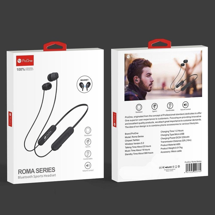 هندزفری بلوتوث «Roma» ساخت شرکت «ProOne»می باشد که با بلوتوث به گجت،تلفن همراه یا پخشکنندهی صوتی دارای بلوتوث متصل میشود.بدنهی این کالا از نوع پلاستیک باکیفیت می باشد.