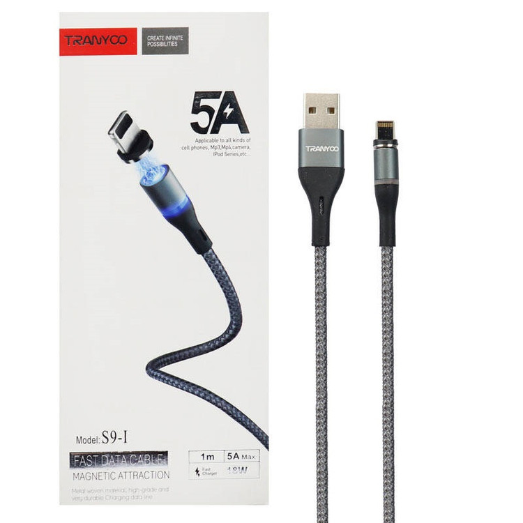 کابل مگنتی ایفون Tranyoo S9-I از دو قسمت ساخته شده است. بخش کوچکی از آن قطعه کوچکی مگنتی شکل است که بصورت ثابت روی درگاه شارژ دستگاه IOS کاربر قرار می گیرد و قسمت دوم آن،کابل شارژی است که بر روی سردیگر آن،قطعه کوچک مگنت دیگری قرارگرفته است و با متصل شدن دو بخش مگنتی به یکدیگر می توانید دستگاه های با درگاه LITNING IOS خود را شارژ کنید و نیازی به ورود و خروج مکرر کانکتور به داخل درگاه دستگاه نیست،در نتیجه خرابی فیزیکی درگاه شارژ دستگاه دیگر پیش نمی آید و همچنین اتصال دستگاه برای شارژ به راحتی انجام می شود.این کابل تا 5 آمپر را ساپورت نموده و همچنین برای شارژ سریع طراحی شده است و کار انتقال دیتا را انجام میدهد.
